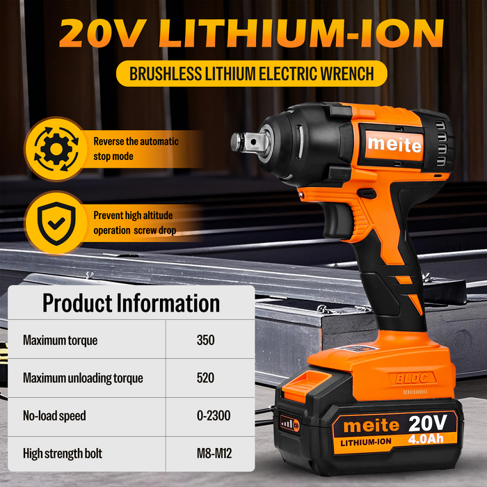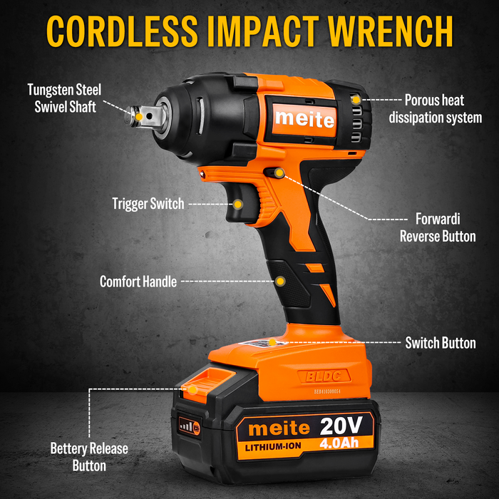 The Meite BL4103 is a high-performance 20V Max Brushless Impact Wrench designed for professional use.