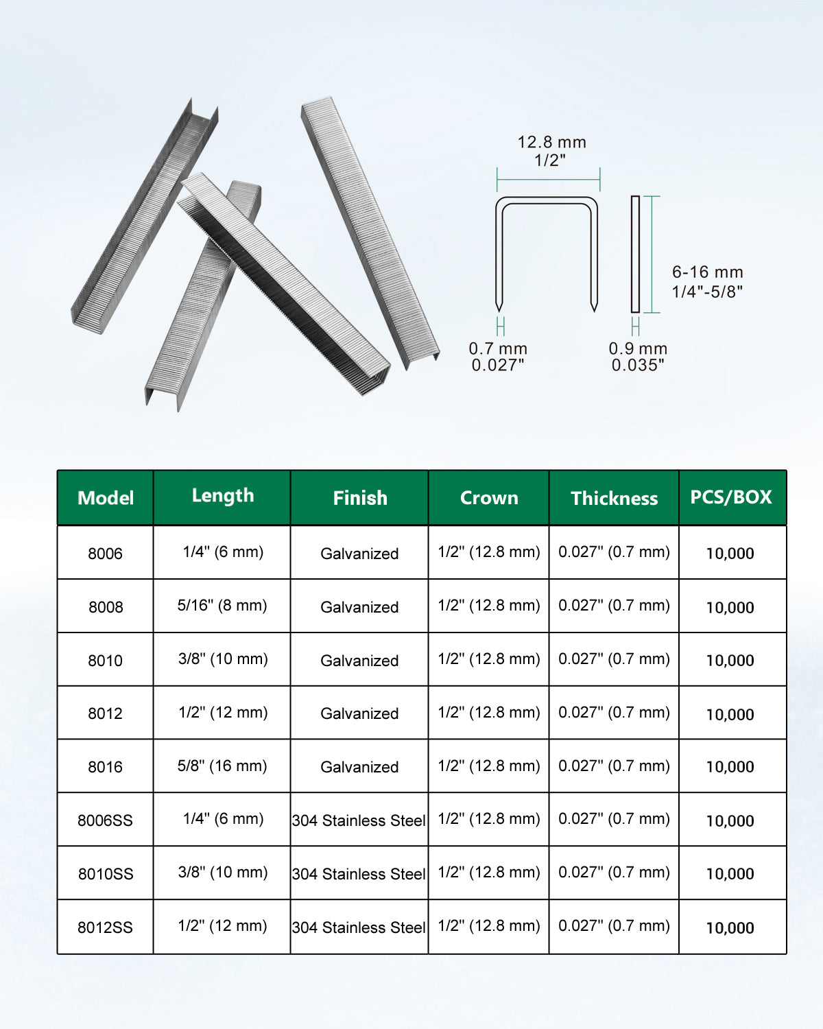 • Varied Sizes: The staples have an extensive range, with lengths including 1/4” (6 mm), 5/16” (8 mm), 3/8” (10 mm), 1/2” (12 mm), 5/8” (16 mm), meeting your different needs for heavy-duty work.