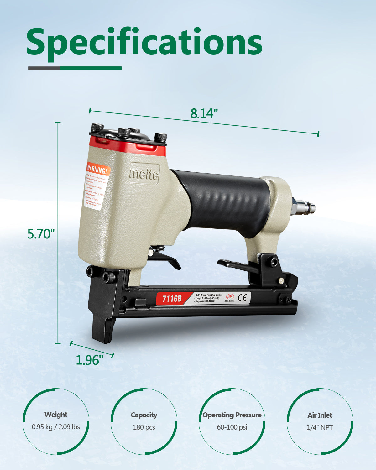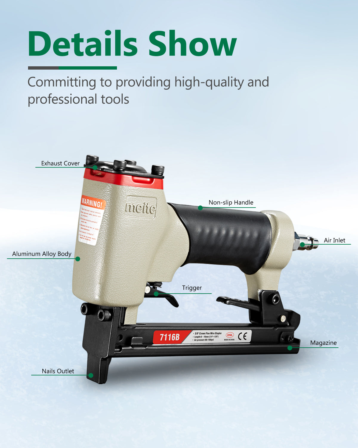 Lightweight and well-balanced 22Ga Pneumatic Upholstery Stapler 7116B is highlight with a magnesium body, bottom load, Jam-free magazine. It is an air-powered pneumatic tool, use with an air compressor.