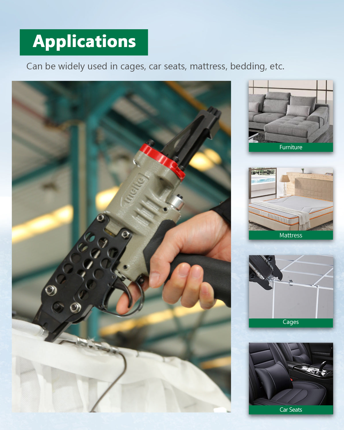 • Applications: Cages, car seats, spring mattress, bag closure, etc.
