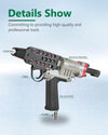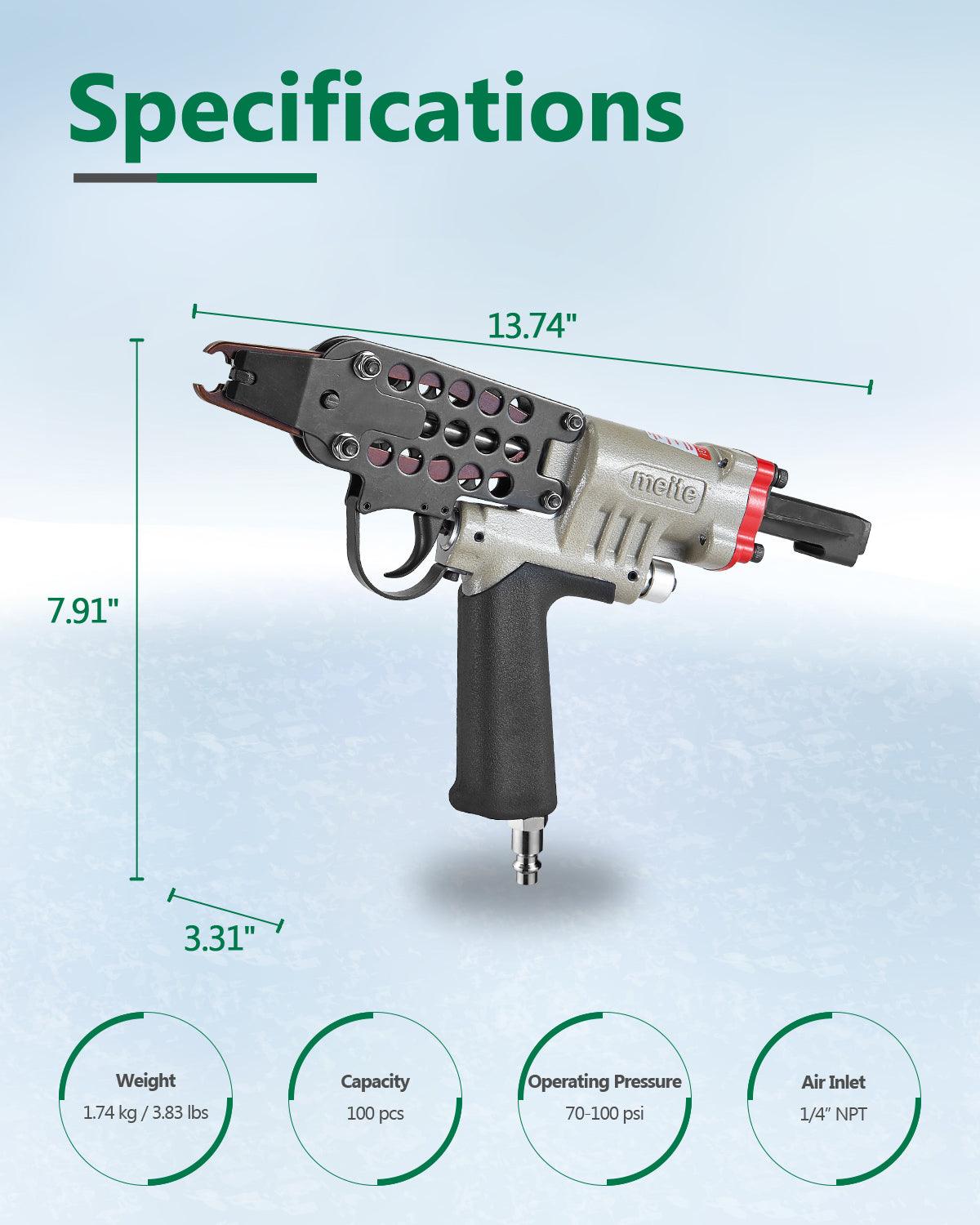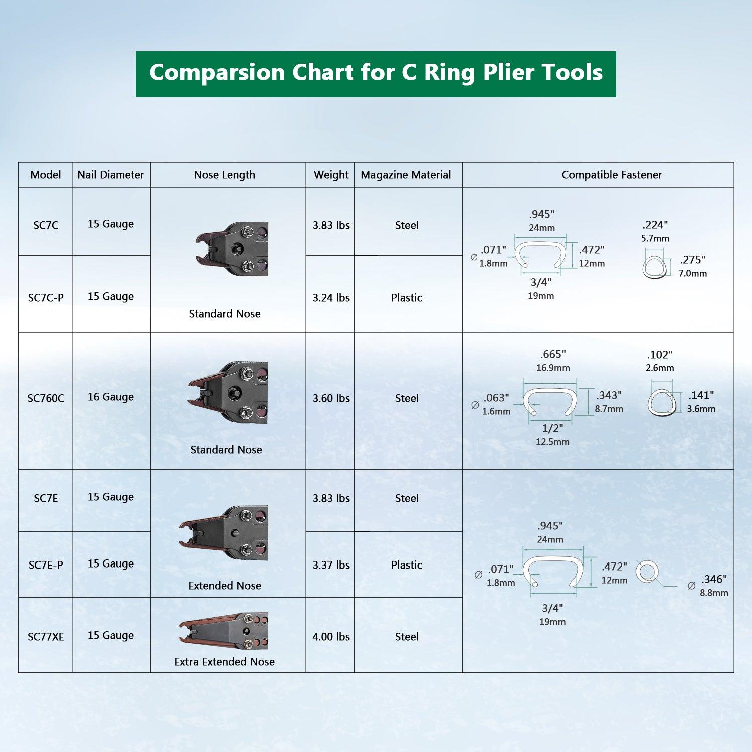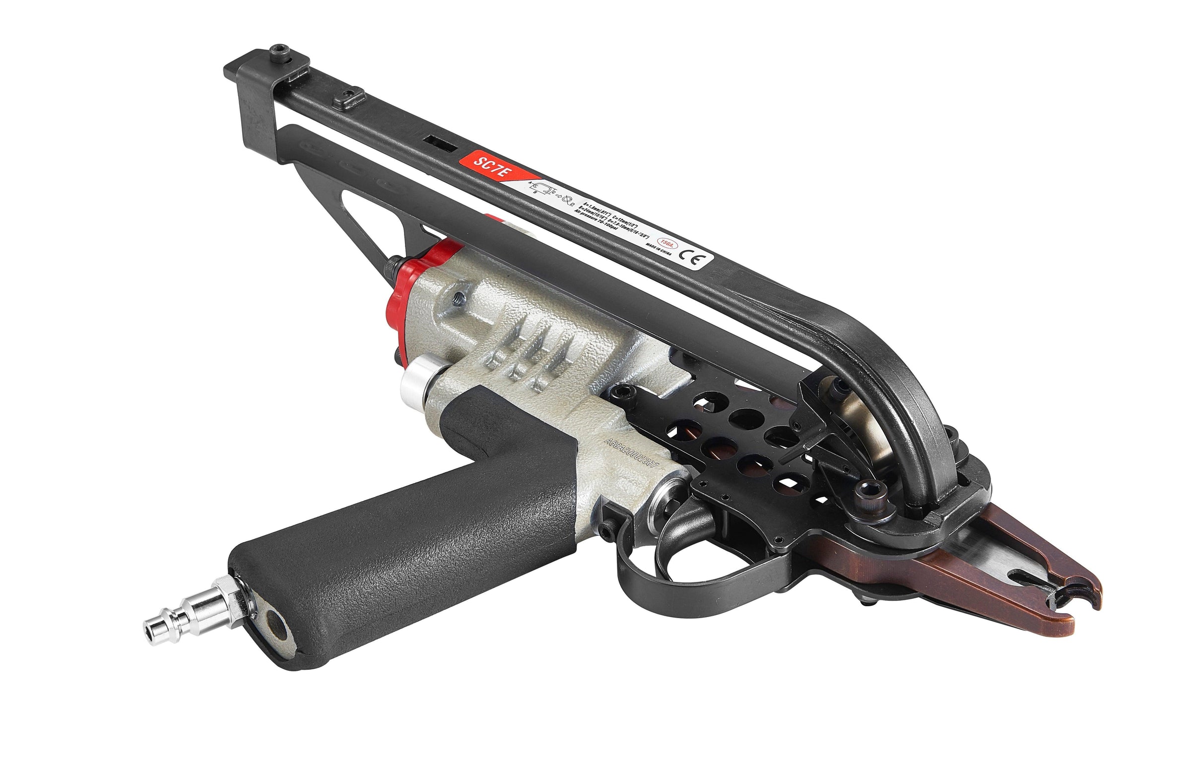 Designed with an extended nose, the SC7E 15Ga Pneumatic Hog Ring Gun ensures precise clamping where space is limited. Ideal for upholstery, wire cages, and industrial assembly.
