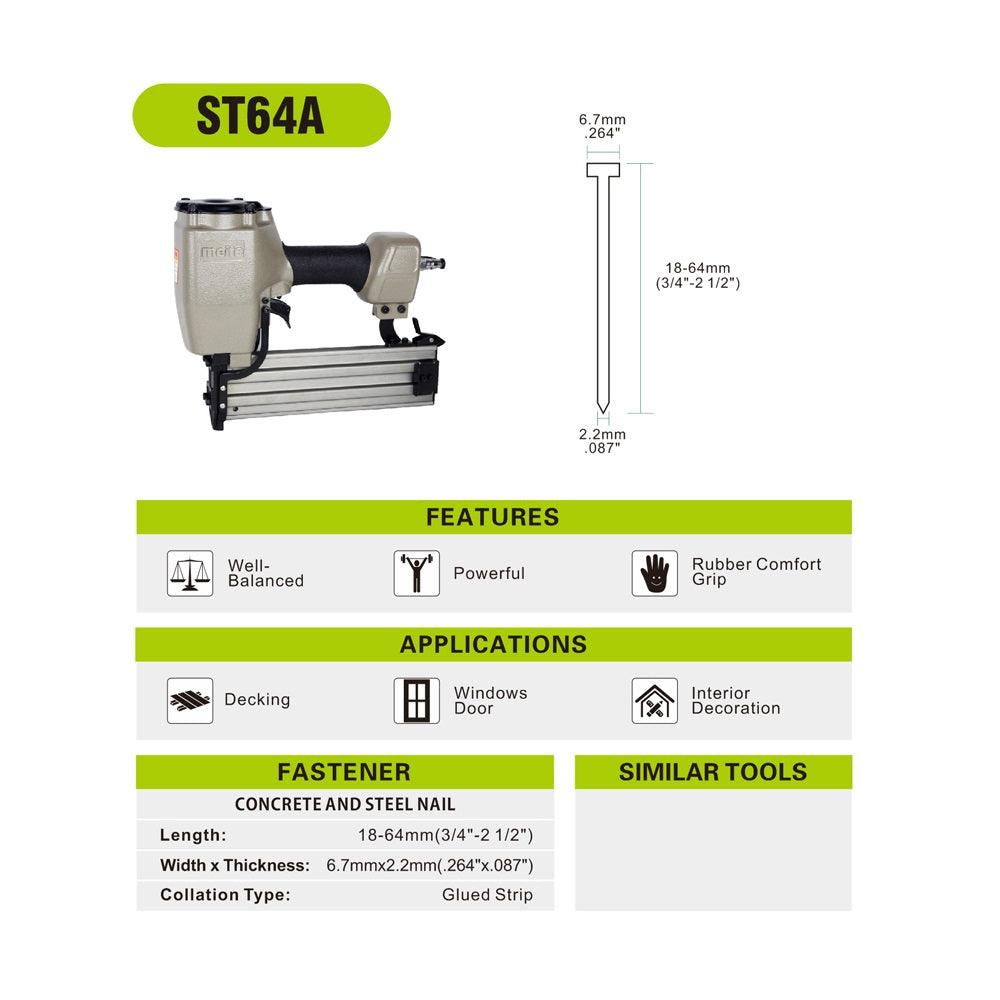 Engineered for durability, the ST64A Pneumatic Concrete T Nailer delivers consistent fastening performance, making construction and remodeling tasks faster and easier.