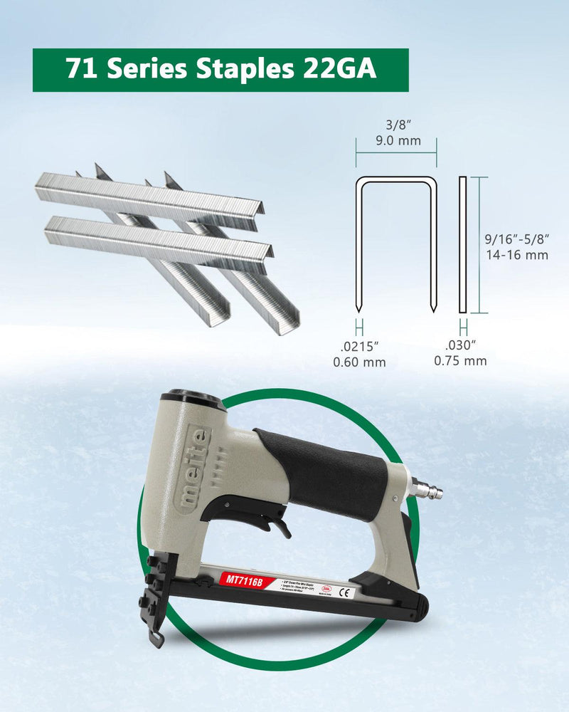 The MT7116B 22Ga Pneumatic Upholstery Stapler features an upgraded muzzle for cleaner, more precise fastening. Perfect for picture frames, trim, and fine upholstery projects.